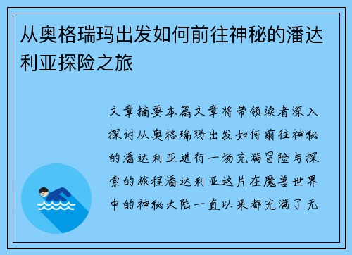 从奥格瑞玛出发如何前往神秘的潘达利亚探险之旅